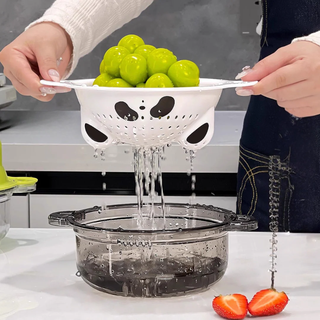 Make kitchen tasks effortless with this adorable double-layer drain basket! Designed with a childlike bear, puppy, or frog shape, it features an inner strainer for quick draining and an outer basket for soaking or storage. Perfect for washing fruits, vegetables, rice, or even small kitchen essentials, its compact design saves space in the fridge. The inverted lid doubles as a storage box, preventing insects and keeping food fresh. Practical, fun, and multi-functional—shake, drain, and store with ease!
