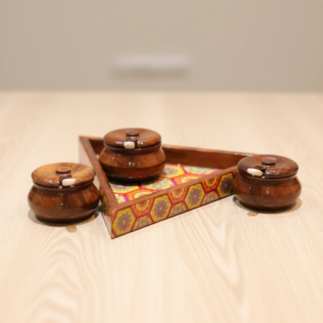 - Handcrafted Wooden Elegance: Made from high-quality sheesham wood, this triangular tray with jars showcases traditional craftsmanship and durability.